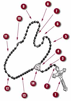 1. Hacer el signo de la cruz y rezar el símbolo de los apóstoles o el acto de contrición 2. Rezar el Padrenuestro 3. Rezar 3 Avemarías y Gloria. 4. Anunciar el primer misterio. Rezar el Padrenuestro. 5. Rezar 10 Avemarías, Gloria y Jaculatoria. 6. Anunciar el segundo misterio. Rezar el Padrenuestro. 7. Rezar 10 Avemarías, Gloria y Jaculatoria. 8. Anunciar el tercer misterio. Rezar el Padrenuestro. 9.Rezar 10 Avemarías, Gloria y Jaculatoria. 10. Anunciar el cuarto misterio. Rezar el Padrenuestro. 11. Rezar 10 Avemarías, Gloria y Jaculatoria. 12. Anunciar el quinto misterio. Rezar el Padrenuestro. 13. Rezar 10 Avemarías, Gloria y Jaculatoria. 14. Rezar la Salve. |